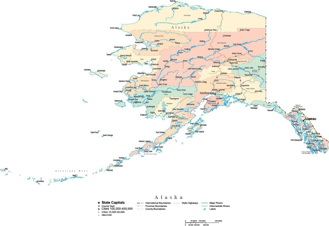 Alaska Digital Vector Map with Counties, Major Cities, Roads